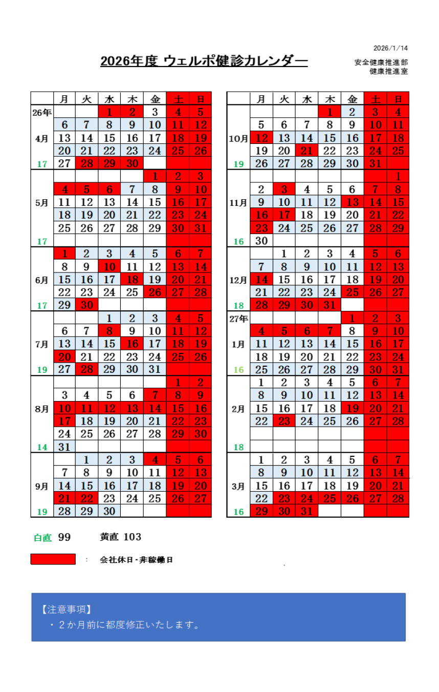 従業員は健診対象月の翌月まで、ご家族は翌々月までが受診期限です。